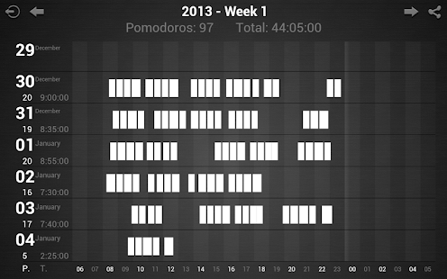 • Persistent statistics on achieved pomodoros with history sharing capabilities.