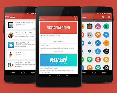 • Naxos Flat Round icon pack may also work with other launchers (KitKat Launchers, Epic Launcher, Unicon, Trebuchet, …), but please be aware that full compatibility is not guaranteed!