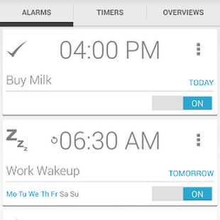 -Fully customizable Alarms (single or repeating on days of your choosing by expanding alarm).